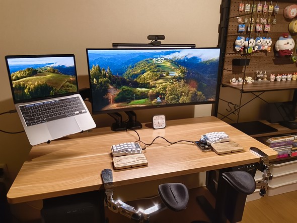 QHD解像度のディスプレイだと縦置きにしても横方向の広さは十分に確保でき、手順書は縦に長いことが多く、縦方向が更に広く使えるため理想的な配置です。出社時と同じ操作環境にするため自宅でもHHKBとトラックボールの組み合わせを利用しています。