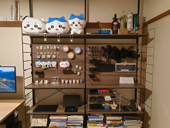 癒やしとガジェットが混在した構成になっています。ラックの左半分は癒やし要素、右半分はサーバやキーボードを置くことで、癒やしも仕事のモチベーションも維持する事ができます。