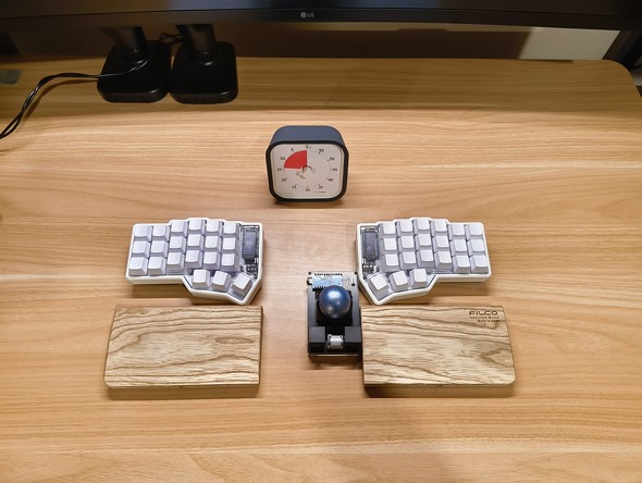 デスクには分割キーボードや小型トラックボール、タイマーなどを使い、快適な環境を維持している他、デスク本体を移動可能にしているため、ラックをオンラインミーティング時の背景にすれば何も語らずともアイスブレークができます。
