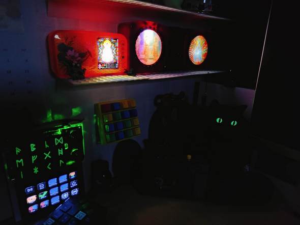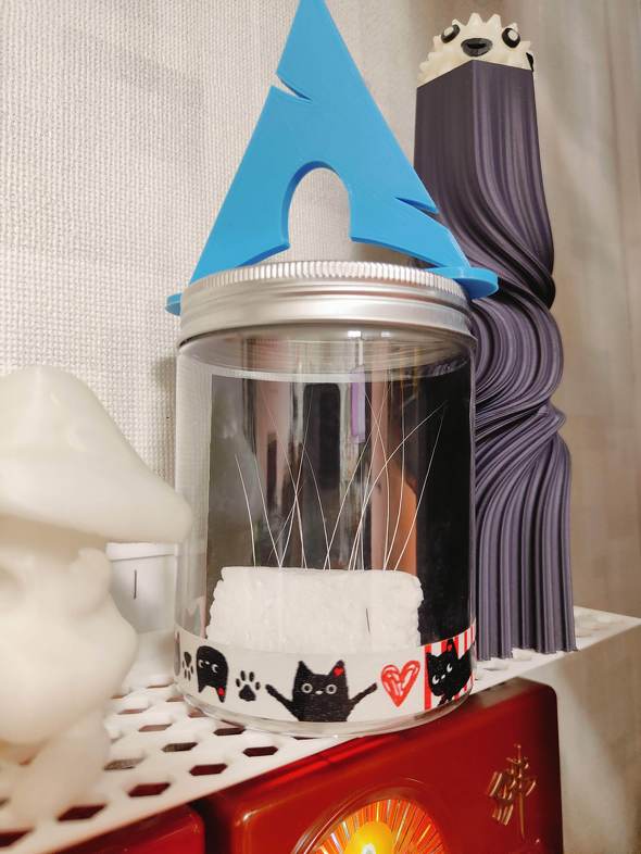 右タブレットでは家電操作や予定表示を行っています。3Dプリンタで謎のオブジェクトやオリジナル棚などを作成し、棚には抜けた猫のヒゲやミュージックプレーヤーの「Buddha Machine」が鎮座しています。