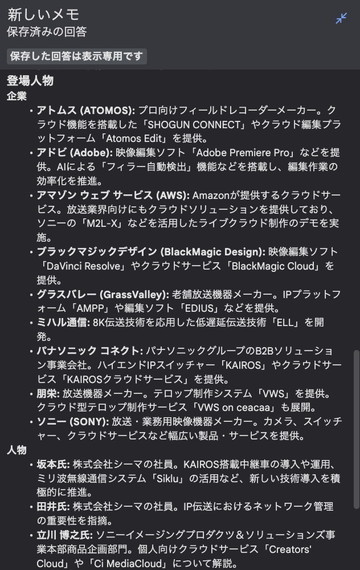 また後半部分は「登場人物」として、企業や取材した人物のまとめも作ってくれる。もちろんこれらはあくまでもソース内から読み取れる情報に限られるので、用語集的な網羅性があるわけではない。
