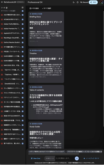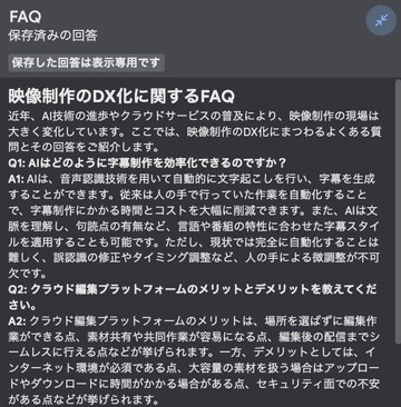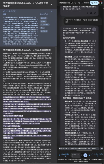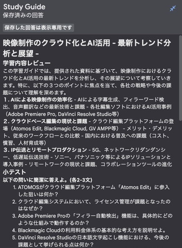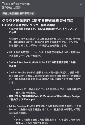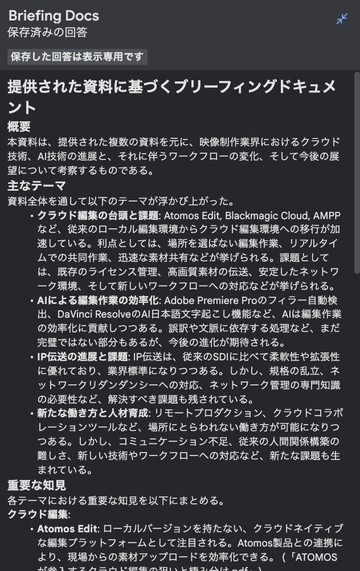 もちろん従来のAI同様、チャットで質問や指示をすることで、総括を得ることができる。例えば「クラウドベースの編集ワークフローにおける課題とは?」という問いに対しては「技術的な課題」「業界構造・慣習に起因する課題」「その他」の3つに分けてまとめてくれる。