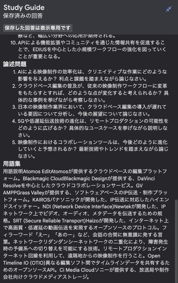 「Study Guide」は、入力ソースを学習用テキストに見立てて、テスト問題を作成してくれる。その回答例も提示してくれる他、論述問題や用語集も作ってくれる。