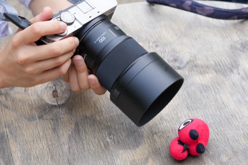 今回はもう1本、小型軽量レンズシリーズということで、100mm F2.8 マクロレンズも使ってみた。2023年秋に登場した中望遠マクロレンズでこれがまた約298g(レンズフードなど含まず)と軽くて約82mmと短いのだ。ちなみに、85mm F1.8のレンズよりちょっと軽い。