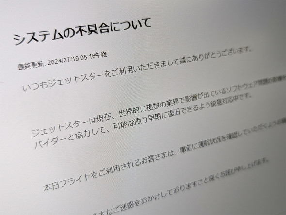 また、ジェットスター・ジャパンは「世界的に複数の業界で影響が出ているソフトウェア問題の影響を受けております」と、ブルースクリーンに関連した障害が発生していると明言。「現在、プロバイダーと協力して、可能な限り早期に復旧できるよう鋭意対応中です」と案内している。