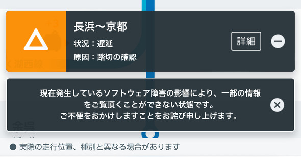 JR西日本では、列車の現在地を知らせるWebサービスでシステム障害が発生。「現在発生しているソフトウェア障害の影響により、一部の情報をご覧いただくことができない状態です」と案内。一部回復しているものの、引き続き復旧作業中とみられる。
