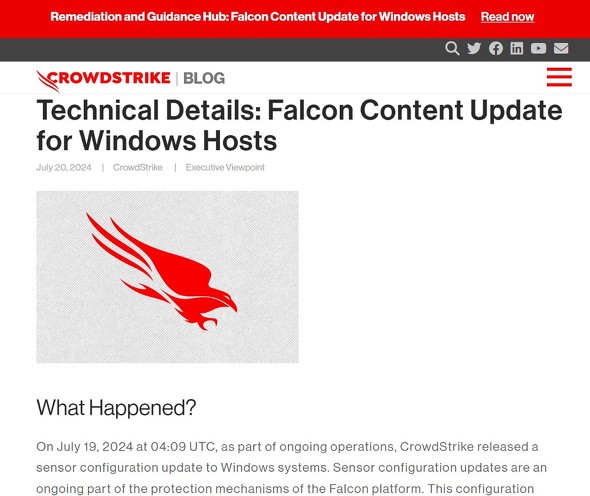 19日午前4時9分にリリースしたWindowsシステムに対するセンサー構成の「チャンネルファイル」の更新(Falconプラットフォームの保護メカニズムに関するもの)によってロジックエラーが発生し、影響を受けるシステムでクラッシュとブルースクリーンが発生。