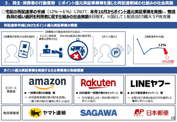 Amazonや楽天、LINEヤフーといったEC事業者と物流事業者各社が参画。置き配やコンビニ受け取り、ゆとりのある配送日時を指定するなど、物流負荷の軽減に寄与する場合にポイントを還元する。