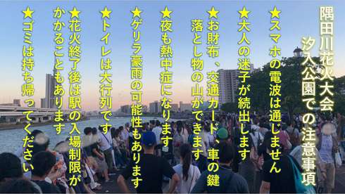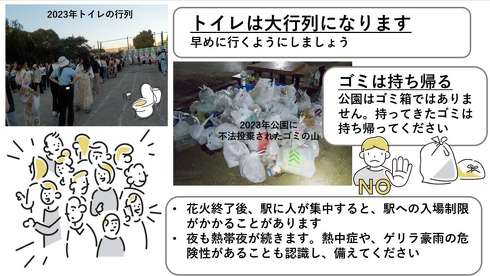 また、トイレは大行列となるため早めに行くことを推奨。ごみは公園には捨てず、持ち帰ってほしいとしている。他にも帰宅時に発生する可能性のある駅の入場規制や、ゲリラ豪雨などにも備えてほしいと説明している。