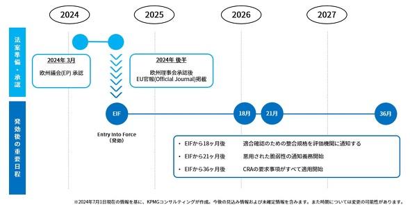CRAは2022年9月、法案が欧州委員会によって公開された後、欧州議会での議論や法案修正を経て、24年3月12日に欧州議会で承認された。24年7月1日現在、欧州委員会での正式採択を待っている状況であり、採択後に発効(EIF: Enter Into Force)することになる。