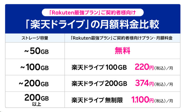 楽天モバイルは7月31日、同社の「Rakuten最強プラン」契約者向け特典として、Rakuten Symphony Koreaが手掛けるクラウドストレージサービス「楽天ドライブ」の50GBプランを月額無料で提供すると発表した。31日から利用可能だ。