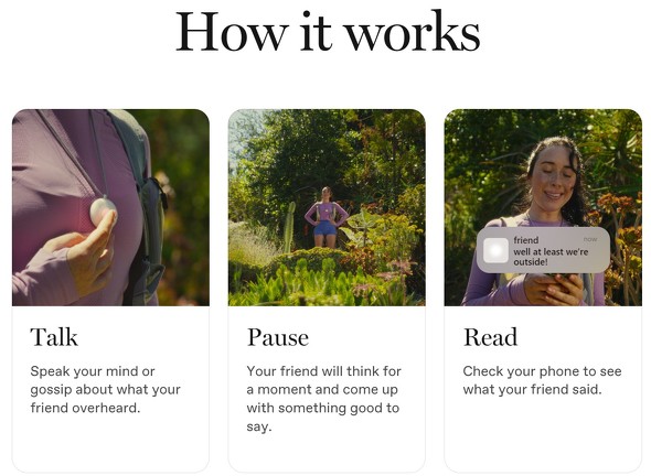 WebサイトのFAQによると、Friendを使うのにサブスクリプションの必要はなく、iPhone(Androidにも対応予定)とBluetoothで接続するだけだ。これで端末は常に周囲の音を聞いて「自分の考えを形成し、いつあなたに話しかけるかを自由意志で決める」という。