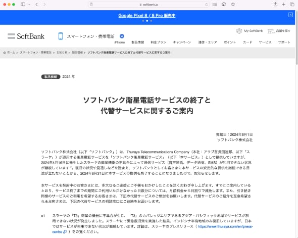 ソフトバンクは8月1日、衛星電話サービスを8月31日で終了すると発表した。4月に発生した衛星機器の故障が長引き、安定的なサービスが提供できないと判断した。