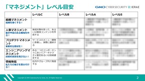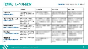 阿部:イエラエの場合、3つの領域、それぞれ5つの業務で15分野に分けた後、その1個1個の“箱”にさらに4段階のレベルを分けています。レベル4まで行けばじゃあ次はこっちにしよう、というかたちで。実力がポイントになっているので、それがそのまま給与にもマッピングされるようにしています。これはSOCですけど、イエラエでは他の分野でも同じようなスキームが採用されるようになりました。
