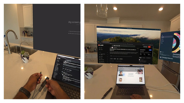 接続してアプリを立ち上げると、ウィンドウの形でHDMI入力した映像が表示される。もちろん任意の場所に動かすことも可能だ。デモでは、iPhoneやMacの外部出力をQuest内で表示している様子を公開。HDMI出力するデバイスの横にキャプチャカードの姿も見える。