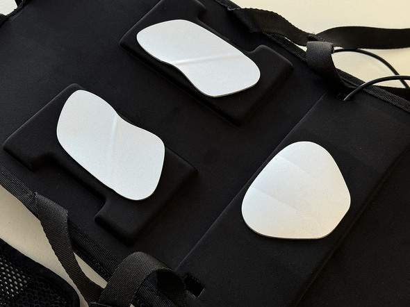 Isarリュックのペルチェ化計画を断念した筆者は、専用品ならどうだろうと気になり始める。そこで、同じくサンコーから出ている「クーリュック2」も試用させてもらった。こちらはペルチェ素子ユニットが最初から内蔵されたリュックで、金属プレートは肩甲骨付近に2つ、腰付近に1つあり結構豪華だ。