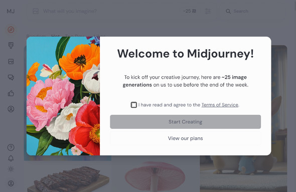 サインアップに必要なのはアカウントのみで、カード情報などは不要だ。生成したコンテンツについてはMidjourneyに「複製、派生作品の作成、公開表示、公開実行、サブライセンス、および配布するための、永続的、全世界的、非独占的、サブライセンス可能、無償、ロイヤリティフリー、取消不能の著作権ライセンスを付与」することになる。(利用規約より)