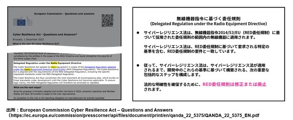 サイバーセキュリティの義務化についてはRED(2025年8月から適用予定)が先で、その後にCRA(適用時期は未定)という順序になる。CRAのサイバーセキュリティの法規制要件がREDよりも緩和されるというのは考えづらく、REDの整合規格について理解しておくことは有益だと考えられる。