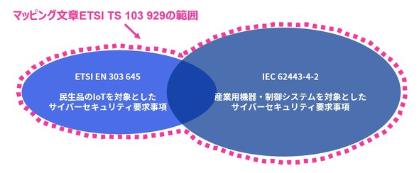 内容を補完するために産業用機器のサイバーセキュリティ規格である「IEC62443-4-2」と組み合わせて使うことが考えられたものの、両規格で重複する内容があるという問題があった。そのため両規格の要求事項(ETSI EN 303 645では5.1〜5.13の項目、IEC62443-4-2はFoundational Requirements 1〜7の項目)から、どの項目を評価に用いるかを関連付けるマッピング文章「ETSI TS 103 929」が発行された。
