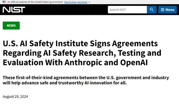 米商務省国立標準技術研究所(NIST)のAI安全研究所は8月29日(現地時間)、米Anthropicおよび米OpenAIの両社とAIの安全性に関する研究、テスト、評価に関する正式な協力を可能にする契約を結んだと発表した。