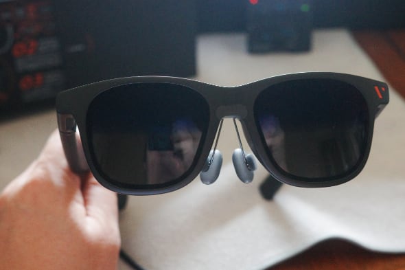 輝度の4000nitという数字だけ見てもよく分からないと思いますが、要するに屋外での使用で問題ないレベルです。さらにワンプッシュでいわゆるサングラス状態する電子調光機能(遮光率は0.5%と40%の2段階)もあるので、画面表示のためのサングラスカバーのようなものも必要ありません。VITURE Proをかけたままで、外を確認することもストレスなくできます。