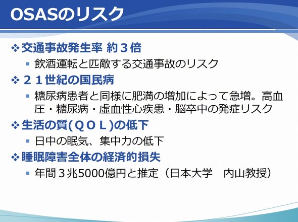 SASは、特に交通事故の原因になりやすいことから、無関係の人の命まで失われる可能性が高い疾患である。仕事効率が下がるということも重要な話だが、人命に関わるという側面は軽視すべきではないだろう。