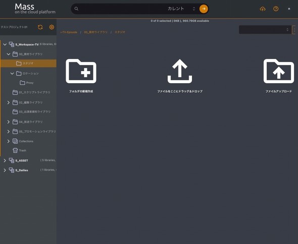 ファイル管理としては、Windowsのエクスプローラのような格好のツリー構造のUIとなっており、ワークフローに応じてプリセットされたフォルダ構造が使えるほか、ローカルで使用している構造をそのまま持っていくこともできる。プロダクションでは決まりのフォルダ構造で制作進行を管理しているところも多いと思うが、そうしたものもそのままコピーしてしまえばいいわけである。