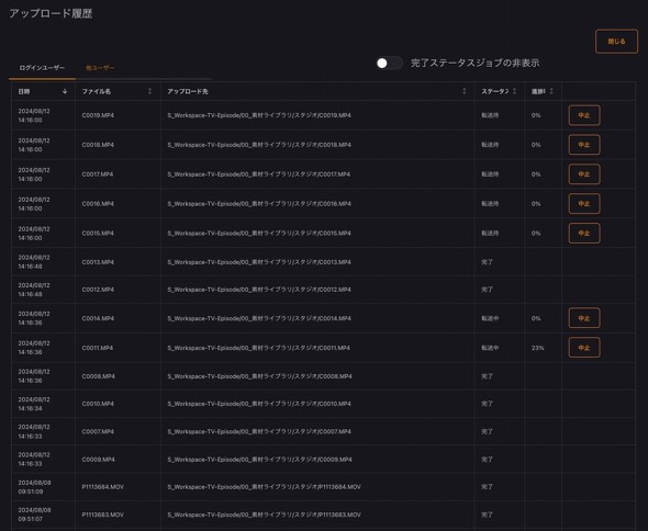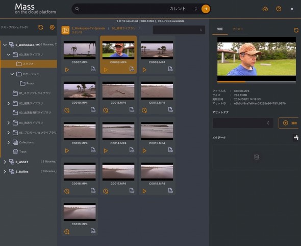 アップロードされたファイルはサムネイルが作成されると共に、自動的にプロキシファイルが生成される。ブラウザ上で動画を再生して中身を確認できるが、それはプロキシを見ているという事である。従ってオリジナルは高解像度の重たいファイルでも、高速にプレビューできる。プロキシ生成状況はサムネイル下のアイコンで確認できる。