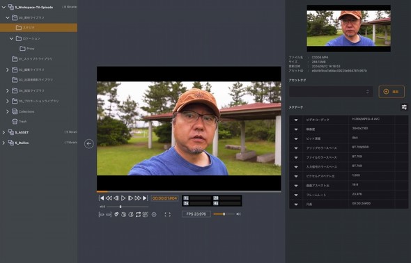 またファイルの解析も同時に行われており、メタデータとしてビデオコーデックや解像度、フレームレートなどが確認できるほか、独自のアセットタグも設定できるので、ここである程度の素材整理も可能だ。