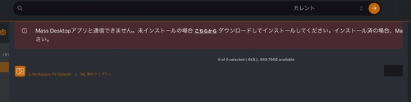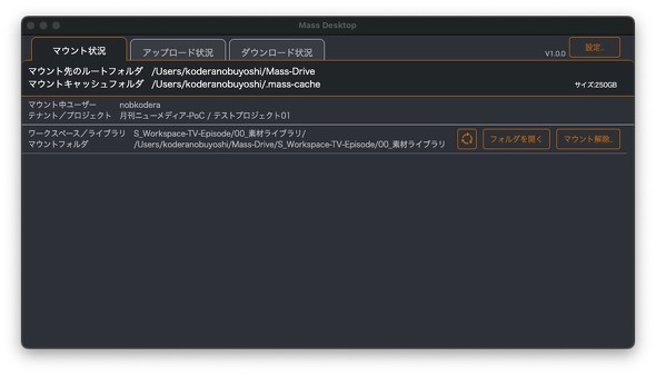 この対応としてMassでは、常駐型のデスクトップアプリ「Mass Desktop」を提供している。ブラウザ上のMassのうちトップレベルはそのワークスペースのダッシュボードになっている。その次の階層で右クリックすると、「Mass Desktop」 - 「マウント」というメニューが出てくる。これを選択すると、Mass Desktopアプリのダウンロードリンクに案内されるという仕組みだ。