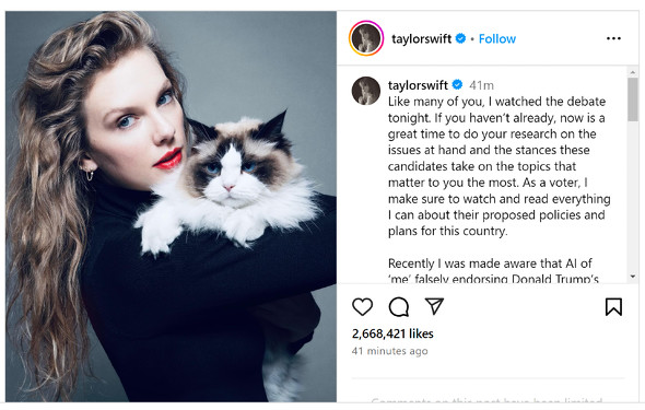 スウィフトさんの投稿は、トランプ氏とハリス氏の初のテレビ討論会の終了直後に行われた。討論会では、トランプ氏は「移民がペットの猫を食べている」などと言ったり、中絶問題について「出産後でも赤子を殺せる州がある」などと言ったりした。
