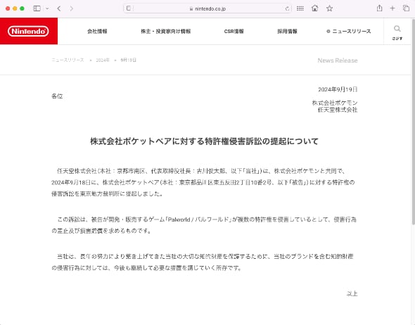 任天堂とポケモン社は9月19日、ゲーム「Palworld/パルワールド」を開発・販売するポケットペア(東京都品川区)を特許権の侵害で訴えたと発表した。18日付で東京地方裁判所に訴訟を提起している。