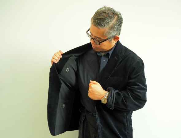 「バルカラー・コートは防風性の高さがポイントなんです。なので、ステッチを入れたり、襟ボタンを2つ付けて、首のサイズに合わせられるようにしています。襟回りは凝って作ってます」と生本さん。伝わりにくい細部も結構こだわってやってますと笑う。