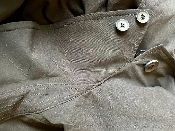 Essential Balcollar Coatの場合も、裾の後ろ側の割れている部分にボタンを付けるとか、襟の後ろの部分にステッチワークを入れて、襟を立てやすくするといった、バルカラー・コートとしての特徴をしっかりと再現している。