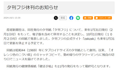 また、夕刊フジの公式サイト「zakzak」も同日に休刊する。zakzakは新聞社によるネット媒体の先駆けとして1996年にスタートした媒体で、知名度も高かった。