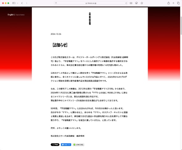 発表にあたり、カラー代表の庵野秀明さんは「50年前『宇宙戦艦ヤマト』に出会わなければ、今の自分はなかった。自分が関わる以上、あらゆるスタッフ・キャストに感謝と敬意と恩返しを込めて、新旧織り交ぜた面白い作品群を残りの人生を費やして可能な限り作り、『宇宙戦艦ヤマト』を後世に遺していけたら、と思っています」としている。