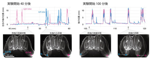 融合現象がどのように起こっているか観察するため、顕微鏡下で融合過程をタイムラプス撮影した。実験開始から約30分後、2個体の切除部分が徐々に癒着し始め、1時間後にはその境界はほとんど見分けがつかないほどに融合が進んだ。その後、徐々に両者の筋収縮が同期し、2時間後には同期率が9割に達したという。