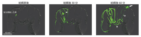 融合個体を顕微鏡で観察すると、それらの消化管がつながっていることが確認できた。融合後のクシクラゲの“片側の個体の口”から蛍光物質で色付けしたえさを与えたところ、片側の個体で消化が進んだ後、融合した消化管を通り、もう片側の消化管へと移動。最終的には“えさを与えていない個体側”の肛門から糞を排出した。