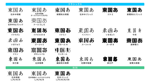 43種のうち30種は、写研から提供を受けたアウトラインデータに加えて不足文字の作成、文字セットなどの仕様の整理を行った「写研クラシックス」として提供。残りは写研の書体を参考にしながら新規にデザインし直した「改刻フォント」として提供する。ラインアップは以下の通り。