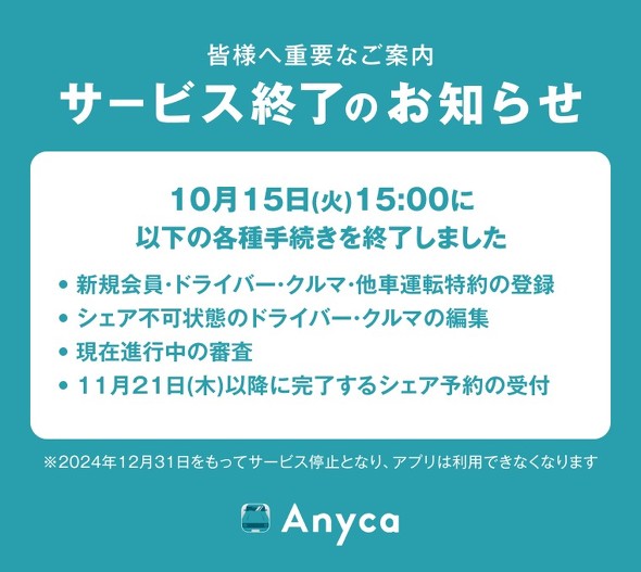 2024年10月15日に新規登録や進行中の審査を終了。10月31日に新規シェア予約受付を終え、12月31日にサービスをすべて終了する。