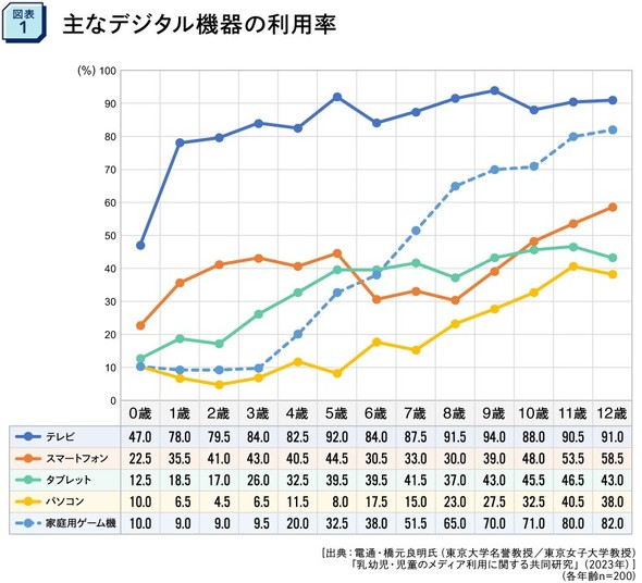 これによれば、0歳から12歳までで最も多く利用するデジタル機器はスマートテレビであり、年齢が上がるにつれて家庭用ゲーム機が上がってくる。スマートフォンは利用低年齢化が懸念されてきたところだが、12歳で58.5%へ到達というのは、体感的には納得できる数字だ。またPCが全年齢で不調なのは予想通りである。