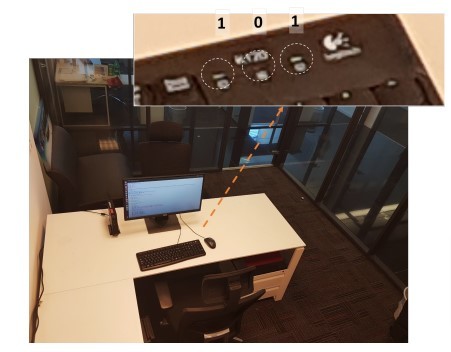 別の攻撃では、キーボードのステータスLEDからひそかに送信される光学信号にデータをエンコードできることを示している。適切な受信機(例:光学センサー)を使用すれば、速度は毎秒数百ビットに達する可能性がある。