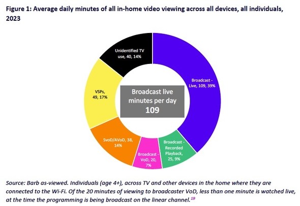 以下の図は、全てのデバイスで人口全体の動画コンテンツの平均消費量を示したものだ。テレビ放送のライブ視聴は、23年においても全動画視聴時間の39%を占める。一方VSP(video-sharing platform:動画共有サイト)と定額制ビデオ・オン・デマンド(SVoD)/広告支援型ビデオ・オン・デマンド(AVoD)といったインターネット勢を合計すれば31%となり、テレビ放送のライブ視聴に匹敵する枠をとっているのが分かる。