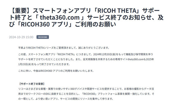 スマートフォンアプリについては、機能・保守開発をともなうサポートについては2024年12月20日、theta360.comについては25年1月15日をもって終了するとしている。