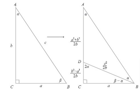 具体的には、元の三角形の3つの角度(α、β、90度)の整数倍の組み合わせで新しい三角形を構成する手法を用いた。この方法により、二等辺直角三角形以外の場合について、2αとβ-αを鋭角とする直角三角形をさまざまな方法で作り出すことができ、それぞれの方法が新しい証明につながることを示した。