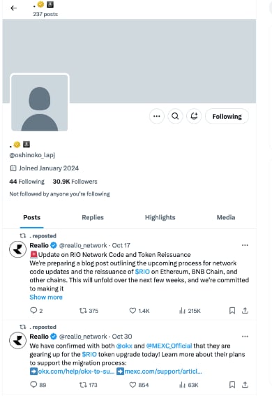 当該アカウントは、暗号資産関連のアカウントをかたり、投稿を続けている模様だ(1日午前10時半時点)。