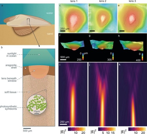 また、殻の窓状構造の下には小さなレンズ状の構造があり、これが光を集束させて貝の軟組織の深部まで届ける働きをしている。このレンズは殻の隆起部より約500〜750μm下方の位置で光を集光し、約1mmの焦点深度を持つ。