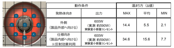 「検証では、環境温度からの温度上昇値を利用しています。例えば室温30度が44度になれば温度上昇値は14度です。約1時間後の温度上昇値は検証用モデルが14.4度だったのに対して、ぽかエコーは34.6度でした。同じ600Wでも、2倍以上の温度変化が記録できました」(菅原さん)