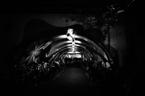 夜、高架下のトンネルをピクチャーコントロール「グラファイト」で。このハイコントラストがいい(24mm 1/40秒 F1.7 ISO280)