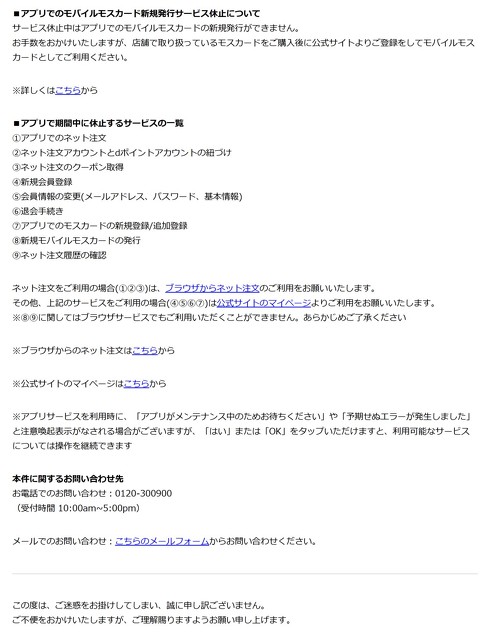 これを受け、モスフードサービスでは、ネット注文やアプリで注文する際のクーポン取得の他、アカウントとdポイントのひも付けもできなくなるとして、Webブラウザの利用を呼び掛けている。クリスマスシーズンに向けたモスチキンの予約サービス「ネット特別予約」と、12月10日から開始する「モス福袋特別予約」についても、各特設サイトでの手続きになるとしている。